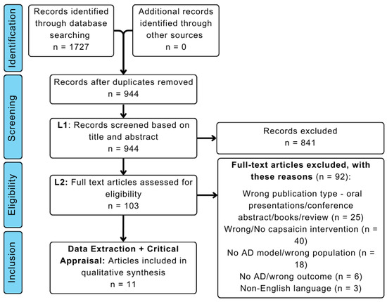 Six databases were searched, as outlined in Materials and Methods. The initial search yielded 1727 records across all databases with no year restrictions; of these, 944 articles underwent Level 1 screening. After the removal of articles with irrelevant titles and abstracts, 103 studies were eligible for Level 2 screening and assessed for relevance to the effect of capsaicin on AD pathology and clinical deficits. Among these 103 studies, 92 studies were excluded, and the resultant 11 studies were extracted for critical appraisal, according to PRISMA guidelines (Figure 2).