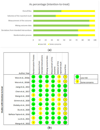 Risk of bias analysis of studies included in the current review: (a) overall bias and bias of methodology, including the selection of reported results, the measurement of outcome, missing outcome data, deviations from intended interventions, and randomisation process; and (b) summary of the risk of bias and concerns [64,65,66,67,68,69,70,71,72,73,74]. Bias is ranked according to low risk (green) and some concerns (yellow).