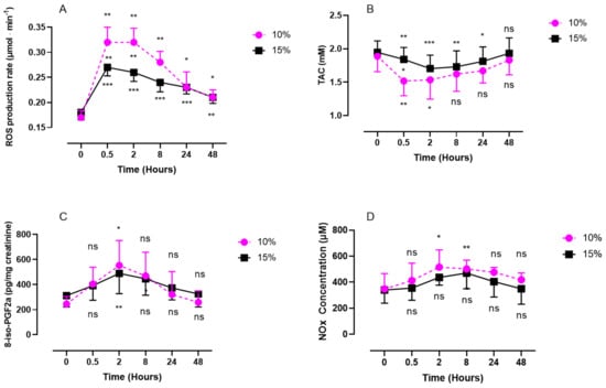 2.1. ROS and NOx Rate, Antioxidant Response (TAC), and 8-Isoprostane (8-iso-PGF2α) Levels after One Hour of Oxygen Exposure at an FiO2 of 10% and 15%