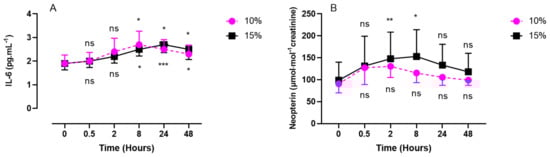 2.2. Inflammatory Response (IL-6, Neopterin, Creatinine, and Uric Acid) after One Hour of Oxygen Exposure at an FiO2 of 10% or 15%