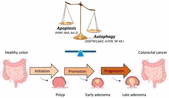 In healthy differentiated adult cells, autophagy delivers to the lysosome damaged cytosolic components and organelles, preventing ageing, and actively participates in intracellular quality control and renovation in order to avoid the formation of protein aggregates that could cause several diseases, including neurodegenerative ones []. In contrast to apoptosis, the intensity of autophagy cell expression decreases in the crypt from the bottom to the top. Autophagy is therefore confined to the lower part of the crypt []. Groulx et al. [] suggested that, in the human colon, autophagy was physiologically present in the normal mucosa and is associated with a region containing the proliferative progenitor/stem cell populations, which are crucial for general metabolism and cellular turnover of the colonic epithelium. The integrity of the complex interaction between cell death and autophagy, a stress-reactive process, is necessary for the normal development and homeostasis of colorectal mucosa. Modifying the classic pathways of the cell death signal is often the trigger for the pathogenesis of various colorectal diseases, for example, chronic diseases and those sustained by a constant inflammation of the colorectal mucosa (Crohn’s disease as well as ulcerative colitis) []. Cancer cells evolve a variety of strategies to escape or circumvent the actions of the apoptotic machinery and program; moreover, autophagy appears to represent an additional barrier that must be overcome during cancer development and progression []. The development of CRC commonly requires three precisely connected steps: initiation, a process that modifies the molecular structure and phenotype of the normal cell; promotion, in which specific signal transduction cascades are activated; and progression, involving the activation of cells that have accumulated relevant gene mutations and phenotypic alterations (Figure 2). Changes in the expression pattern levels of different apoptotic proteins during the adenoma–carcinoma sequence highlights the crucial role of apoptosis during the progression of colon cancer. Moreover, both pro- and anti-apoptotic factors are upregulated in adenomas; therefore, tumor progression is probably due to a balance between these factors [].