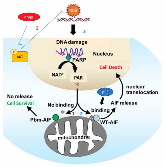 Mechanism by which p53 promotes the apoptosis of human colon cancer cell lines by releasing and transferring AIF into the nucleus after the formation of the PAR polymer. This death signaling pathway is inhibited by p53 deletion or mutation and protective autophagy is increased by inhibition of AKT. *1, No binding between PAR and AIF; *2, binding between PAR and AIF [AIF, apoptosis-inducing factor; AKT, protein kinase B; NAD, Nicotinamide adenine dinucleotide; p53, protein-53; PAR, poly (ADP-ribose); PARP, poly (ADP-ribose) polymerase].