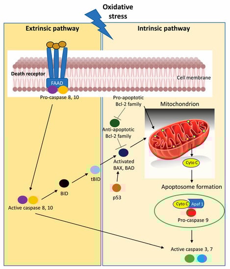 Oxidative stress promotes the activation of programmed cell death initiated by intrinsic apoptotic signaling in the mitochondria or extrinsic apoptotic signaling by death receptor pathways in CRC cells. [Apaf 1, Apoptotic protease activating factor 1; BAD, Bcl-2-Associated agonist of cell death; BAX, Bcl-2-associated X protein; Bcl-2, B-cell lymphoma-2; BID, BH3-interacting domain death agonist; cyto c, cytochrome c; tBID, C-terminal fragment termed truncated Bid].
