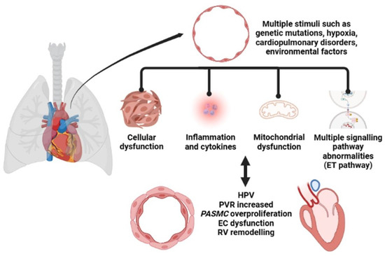 In addition to environmental factors (e.g., hypoxia, air pollution) and endothelial dysfunction, mutations in bone morphogenetic protein receptor 2 (BMPR2), activator receptor-like kinase 1 (ALK1), endoglin, and other genetic predispositions [7] are multiple factors contributing to PH, as are somatic circulatory factors such as pro-coagulation and inflammation and the expressions of many ion channels and receptors [8].