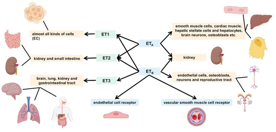 In the human body, both receptors are abundantly distributed in the kidney, while ETA receptors are found mainly in smooth muscle cells, cardiac muscle, hepatic stellate cells and hepatocytes, brain neurons, osteoblasts, etc. ETB receptors are found mainly in ECs, osteoblasts, neurons of the central and peripheral nervous system, and various cells of the reproductive tract [50]. In the pulmonary arterial system, ETA receptors mediate the proliferation of vascular smooth muscle cells and vasoconstriction, whereas ETB receptors are located primarily on ECs, where they mediate vasodilation through the release of NO and prostaglandin-I-2 [51,52]. Figure 2 shows the relationship between the different isoforms of ET and the receptor subtypes, including their differences.