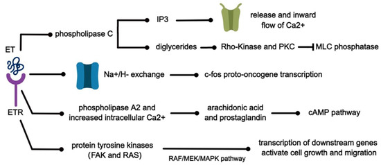 ET can interact with a variety of substances to initiate the corresponding signaling pathways and produce multiple biological effects. Several of these pathways are shown in Figure 4. When ET binds to its specific receptor, it activates phospholipase C and produces inositol triphosphate (IP3) and diglycerides [61]. It has been demonstrated in isolated rabbit arteries that IP3 subsequently diffuses to specific receptors on the endoplasmic reticulum, which in turn promote the release of Ca2+ from intracellular calcium stores and the inward flow of calcium through voltage-dependent calcium channels [62] and can induce mitogenesis. At the same time, the accumulation of diglycerides in turn activates Rho-Kinase and PKC, leading to the inhibition of myosin light chain (MLC) phosphatase [63]. Subsequently, the sensitivity of myofilaments to Ca2+ increases and the phosphorylation of MLC initiates the contraction of smooth muscle cells [62,64]. ET causes cytoplasmic alkalinization through the activation of Na+/H− exchange, resulting in increased transcription of c-fos proto-oncogene and biochemical signals associated with proliferation [64]. In addition, ET-1 stimulates arachidonic acid production and prostaglandin release through the activation of phospholipase A2 and increased intracellular Ca2+, leading to the activation of the cAMP pathway. It can play an important role in lung diseases by mutually regulating protein expression through MAPK and AMPK signaling pathways, leading to the transcription of downstream genes and ultimately activating cell growth and migration [65,66].