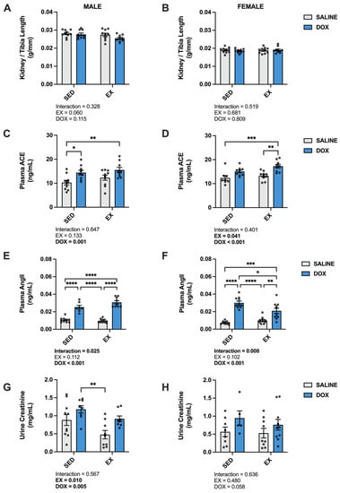 (A,B) Kidney/tibia length, (C,D) plasma levels of angiotensin converting enzyme (ACE), (E,F) plasma levels of angiotensin II (AngII), and (G,H) levels of urine creatinine from sedentary (SED) or exercise-preconditioned (EX) male (left) and female (right) rats treated with doxorubicin (DOX) or saline. Data are presented as mean ± SEM. Two-way ANOVA differences are indicated below the graphs. Circles indicate individual data points. * = significant difference between groups (p < 0.05), ** = significant difference between groups (p < 0.01), *** = significant difference between groups (p < 0.001), **** = significant difference between groups (p < 0.0001).