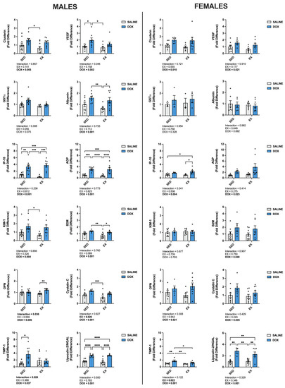 Multiplex analysis of urine from each treatment group was also performed to determine changes to markers of nephrotoxicity (Figure 2). For males, a main effect of DOX existed for clusterin, IFN-gamma-inducible protein 10 (IP-10), kidney-injury molecule-1 (KIM-1), osteopontin (OPN), tissue inhibitor matrix metalloproteinase-1 (TIMP-1), vascular endothelial growth factor (VEGF), albumin, α-1 acid glycoprotein (AGP), β-2-microglobulin (B2M), cystatin c and neutrophil gelatinase-associated lipocalin (Lipocalin-2/NGAL) (p < 0.05). Cystatin c also showed a main effect of EX (p < 0.05). In addition, multiple comparisons revealed a significant increase in IP-10, AGP and Lipocalin-2/NGAL in SED-DOX and EX-DOX male rats compared to SED-SALINE and EX-SALINE (p < 0.05). SED-DOX was significantly elevated for clusterin, KIM-1 and cystatin c compared to EX-SALINE (p < 0.05). SED-DOX and EX-DOX had higher levels of urine albumin and B2M compared to EX-SALINE (p < 0.05). In addition, OPN was elevated in EX-DOX compared to EX-SALINE, TIMP-1 was elevated in SED-DOX compared to SED-SALINE and VEGF was elevated in SED-DOX compared to SED-SALINE and EX-SALINE (p < 0.05). Urine from female rats showed main effects of DOX for clusterin, IP-10, OPN, TIMP-1, VEGF, AGP, B2M, cystatin c and Lipocalin-2/NGAL. Main effects of EX were only seen for TIMP-1. Multiple comparisons showed a significant increase in urine IP-10 in EX-DOX compared to SED-SALINE and EX-SALINE, in TIMP-1 in SED-DOX compared to all other groups and in Lipocalin-2/NGAL in SED-DOX and EX-DOX compared to both saline-treated control groups (p < 0.05).