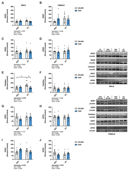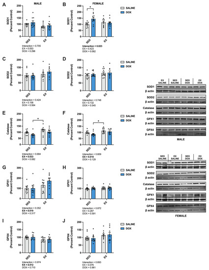 Liver protein expression of (A,B) superoxide dismutase (SOD) 1, (C,D) SOD2, (E,F) catalase, (G,H) glutathione peroxidase (GPX) 1, and (I,J) GPX4 primary antioxidants from sedentary (SED) or exercise-preconditioned (EX) male (left) and female (right) rats treated with doxorubicin (DOX) or saline. Data are presented as mean ± SEM. Representative western blots are shown to the right of the graphs. Two-way ANOVA differences are indicated below the graphs. Circles indicate individual data points. * = significant difference between groups (p < 0.05).