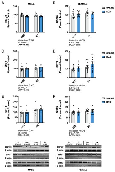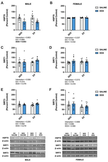 Liver protein expression of (A,B) heat shock protein 70 (HSP70), (C,D) sirtuin (SIRT) 1, and (E,F) SIRT3 from sedentary (SED) or exercise-preconditioned (EX) male (left) and female (right) rats treated with doxorubicin (DOX) or saline. Data are presented as mean ± SEM. Representative western blots are shown below the graphs. Two-way ANOVA differences are indicated below the graphs. Circles indicate individual data points.