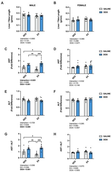 (A,B) Liver/tibia ratio, (C,D) plasma levels of aspartate aminotransferase (AST), (E,F) plasma levels of alanine transaminase (ALT), and (G,H) ratio of AST/ALT from sedentary (SED) or exercise-preconditioned (EX) male (left) and female (right) rats treated with doxorubicin (DOX) or saline. Data are presented as mean ± SEM. Two-way ANOVA differences are indicated below the graphs. Circles indicate individual data points. * = significant difference between groups (p < 0.05). ** = significant difference between groups (p < 0.01), *** = significant difference between groups (p < 0.001).