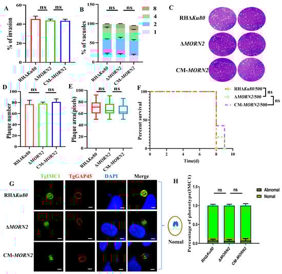 Absence of MORN2 did not affect parasite invasion and proliferation. (A) Differential invasion efficiency of RHΔKu80, ΔMORN2, and CM-MORN2 strains; n = 3, a representative experiment from two independent assays; ns: not significant. (B) Intracellular replication assay for evaluating in vitro proliferation of RHΔKu80, ΔMORN2, and CM-MORN2 strains. Tachyzoites were counted in 100 PVs. Data represent mean ± SEM for two independent experiments. (C) Plaque assays used to compare the overall growth capacity of RHΔKu80, ΔMORN2, and CM-MORN2 strains. (D,E) The number and area of the plaque assay; ns: not significant. (F) Survival curves of BALB/c mice (500 tachyzoites per mouse; n = 5 mice per group) infected with RHΔKu80, ΔMORN2, or CM-MORN2 strains. The mice were divided into three groups. Every mouse was monitored daily until death; ns: not significant. (G) Utilization of IFA to observe T. gondii division. TgIMC1: inner membrane complex of progeny; TgGAP45: glideosome-associated protein; TgIMC1 protein (green) and TgGAP45 (red) strains body profile. Scale, 2.5 μm; DAPI (nuclear dye): 4’,6-Diamino-2-phenylindole. (H) Graph shows the percentages of vacuoles in RHΔKu80, ΔMORN2, and CM-MORN2 strains. Randomly selected vacuoles (n = 100) from two independent experiments were quantified.