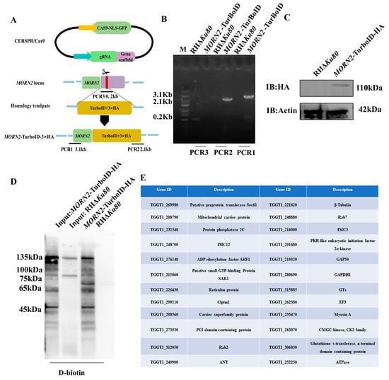 MORN2-TurboID-HA-directed protein biotinylation. (A) Schematic diagram of CRISPR/CAS9-mediated insertion of TurboID-HA into the C-terminus of TgMORN2. PCR1 and PCR2 detected the correct insertion sites, and PCR3 detected the MORN2 endogenous locus. (B) Diagnostic PCR demonstrating homologous integration and gene disruption in the TgMORN2-TurboID-HA strain compared to the parental line RHΔKu80. (C) Immunoblot assays to check the expression of TgMORN2-TurboID-HA fusions in transgenic parasites. (D) Visualization of biotinylated proteins in parasites. Western blot comparing the profile of biotinylated proteins from lysates of RHΔKu80 and TgMORN2-TurboID-HA parasites. Biotinylated proteins were detected by horseradish peroxidase (HRP)-conjugated streptavidin. (E) Analysis of mass spectrometry data.