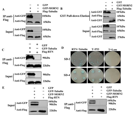 It has previously been reported that reticulum proteins can interact with tubulin in nerve cells [26]. Therefore, β-Tubulin was selected based on the mass spectrometry results to further verify its interaction with MORN2. To confirm whether TgMORN2 binds to β-Tubulin, Co-IP assays were performed in HEK293T cells transfected with pEGFP-MORN2 and pCMV-Flag-β-Tubulin. The results showed that GFP-MORN2 was detected in the sediment (Figure 6A), suggesting that β-Tubulin and MORN2 interact in vivo. In addition, a GST pull-down assay demonstrated that TgMORN2 interacted directly with the β-Tubulin in vitro (Figure 6B). This further confirmed that TgMORN2 interacts with β-Tubulin. As TgMORN2 interacts with TgRTN and β-Tubulin, the relationship between TgRTN and β-Tubulin needs to be explored. To examine this interaction, Co-IP assays was performed. The pEGFP-β-Tubulin and pCMV-Flag-RTN plasmids were co-expressed in HEK293T cells. As shown in Figure 6C, a specific signal for GFP-β-Tubulin was clearly observed in the Flag-RTN immunoprecipitation. Subsequent yeast two-hybrid (Y2H) experiments revealed that co-transformation of pGBKT7-RTN and pGADT7-β-Tubulin into Y2HGold yeast cells resulted in growth on SD/-Leu/-Trp/-Ade/-His + X-α-gal (SD-4) plates and blue color development (Figure 6D). Additionally, Co-IP analysis confirmed the interaction among the TgRTN, TgMORN2, and β-Tubulin proteins. Flag-RTN was detected using anti-Flag antibodies, and GFP-tagged TgMORN2 and β-Tubulin could be detected by anti-GFP immunoblotting (Figure 6E). Previous studies suggested an intrinsic link between ER stress responses and the microtubule network [31]. Therefore, we speculate that TgMORN2 may be related to the endoplasmic reticulum stress of T. gondii.