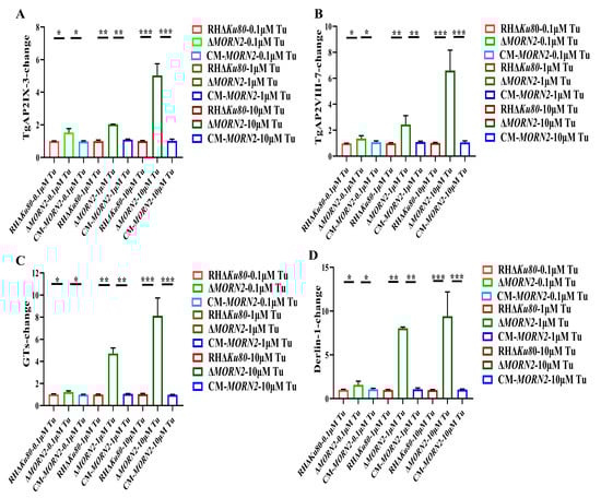 The tachyzoites of the RH∆Ku80, ΔMORN2, and CM-MORN2 strains were stimulated with 0.1 μM, 1 μM, and 10 μM Tu for 1 h. Total RNA was extracted using TRIzol reagent following the manufacturer’s suggestions. The extracted RNA was reverse transcribed into cDNA using the StarScript II Reverse Transcriptase (GenStar Co., Ltd., Beijing, China); then, the target gene expression levels were measured using qPCR with SYBR qPCR Master Mix (Vazyme, Nanjing, China) using LightCycler®96 (Roche, Basel, Switzerland). TgGADPH was used as a reference gene. The qPCR program included a denaturation step at 94 °C for 30 s, followed by 40 cycles of 94 °C for 5 s and 60 °C for 30 s. The comparative 2−ΔΔCt method was applied to analyze the relative levels of gene expression.