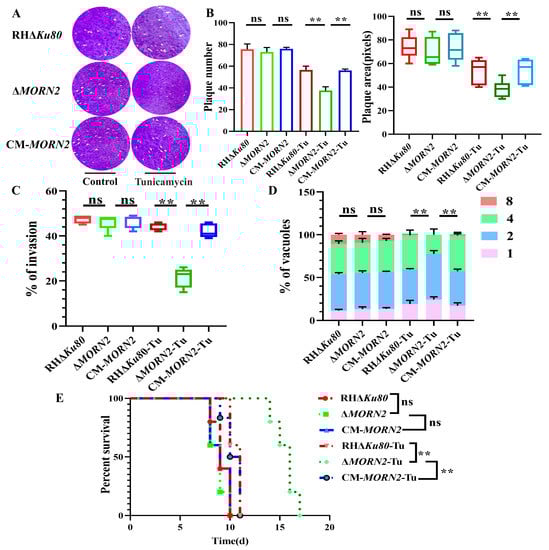 Loss of MORN2 causes intolerance of T. gondii to ER stress. (A) Plaque assays were used to compare the overall growth ability of the RHΔKu80, ΔMORN2 and CM-MORN2 strains. (B) The number and area of the plaque assay; ns: not significant; **, p < 0.01. (C) Different invasion efficiencies of Tu-stimulated RHΔKu80, ΔMORN2, and CM-MORN2 strains; ns: not significant; **, p < 0.01. Graph represents mean ± SEM for two independent experiments. (D) Intracellular replication assay used to evaluate the proliferation of RHΔKu80, ΔMORN2, and CM-MORN2 strains in vitro after stimulation with Tu; ns: not significant; **, p < 0.01. Two-way ANOVA mean ± SEM for three independent experiments. (E) Survival curve of mice infected with the designated strains. RHΔKu80, CM-MORN2, and ΔMORN2 strains stimulated with 10 μM were infected with BALB/c mice by intraperitoneal injection. Each group was composed of five mice, and a mouse was challenged with 500 tachyzoites. Every mouse was monitored daily until death; ns: not significant; **, p < 0.01, Gehan–Breslow–Wilcoxon tests.