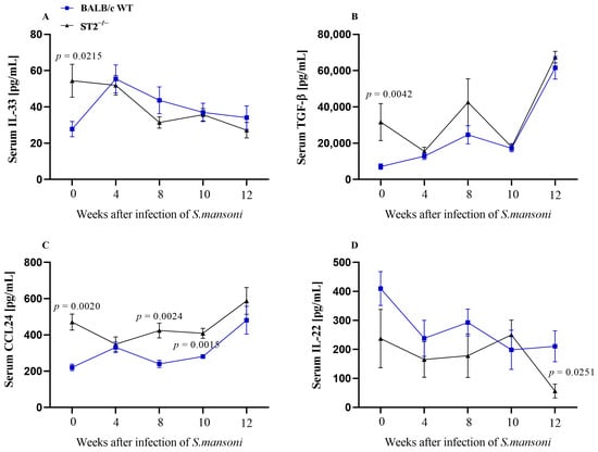 Serum cytokines levels. Evaluation of IL-33 (A), TGF-β (B), CCL24 (C), and IL-22 (D) levels estimated by enzyme-linked immunosorbent assay (ELISA) in serum samples from WT (blue squares) and ST2−/− (black triangles) mice. Mice were subcutaneously infected with 50 S. mansoni cercariae and the serum was collected at weeks 4, 8, 10, and 12 post infection. Data are shown as kinetics and are presented as mean ± standard error of the mean (SEM). Normality was determined by the Kolmogorov–Smirnov test. Comparisons between normally distributed groups were carried out by Student’s t-test, and p-values were assigned. Differences between WT and ST2−/− mice in the same phase of infection are represented by their p-value.