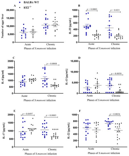 Consistent with our previous data [50], the number of S. mansoni eggs retained in the liver of both WT and ST2−/− mouse strains was statistically similar throughout the infection (Figure 2A). Unlike that observed in serum, IL-33 levels in the liver are significantly lower in ST2−/− mice compared with WT mice in both stages of infection (Figure 2B). Furthermore, we observed that egg retention induces the activation of a Th2 response even in the absence of the ST2 receptor, as seen by the concentrations of IL-4 and IL-13 in the liver; however, this response is not maintained in the chronic phase of infection, when ST2−/− mice showed significantly lower levels of these cytokines than the infected WT mice (Figure 2C,D).