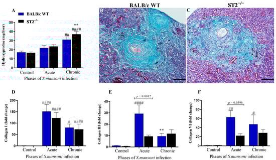 Evaluation of collagen induction and deposition in the liver of WT and ST2−/− mice infected with S. mansoni. Quantification of hydroxyproline concentrations in the livers of WT and ST2−/− mice after experimental infection with S. mansoni (A). Photomicrographs of Masson’s Trichrome-stained hepatic granulomas of WT (B) or ST2−/− (C) mice chronically infected (14 weeks) with S. mansoni. Scale bars = 50 µm. Relative quantification of mRNA expression of Col I (D), Col III (E), and Col VI (F) in the livers of WT and ST2−/− mice. RT-PCR was performed by extracting mRNA from the liver homogenate from uninfected WT and ST2−/− mice or mice at weeks 8 (acute infection) and 12 (chronic infection) of S. mansoni infection. Chart bars show mean ± SEM of 12 mice per group (A) and 5 mice per group (D–F). Normality was determined by the Kolmogorov–Smirnov test. Comparisons between groups were performed by two-way ANOVA followed by Bonferroni’s post-test, and p-values were assigned. Differences between WT and ST2−/− mice in the same phase of infection are represented by their p-value. # represents significant differences between infected mice and their uninfected controls; asterisk represents significant differences between chronically infected mice compared with mice of the same strain in the acute phase of infection (# p < 0.05; ** or ## p < 0.01; #### p < 0.0001).