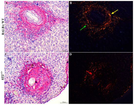The reduction of type III collagen fibres in liver granulomas of infected ST2−/− mice was confirmed by Picrosirius staining. Although red-stained collagen fibres were observed in the granulomatous reactions around parasite eggs trapped in the livers of both mouse strains in chronic schistosomiasis (Figure 6A,C), the analysis of stained liver sections under polarised light confirmed that granulomas from WT mice (Figure 6B) presented red and green collagen fibres, which represent type I and III collagens, respectively, with overlapping type I and III fibres shown in yellow. In contrast, collagen fibres in liver granulomas from infected ST2−/− mice were almost all red under polarised light, indicating a clear predominance of type I collagen (Figure 6D).