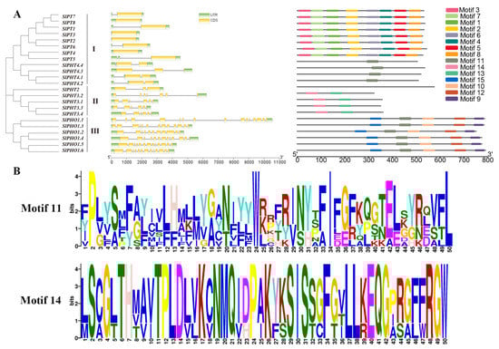 Phylogenetic relationship, gene structure, and motif analysis of the SlPHT genes. (A) The phylogenetic tree was constructed by the NJ method implemented in MEGA 11 software with 1000 bootstrap replicates. Exons are represented by green rectangles, and gray lines represent introns. The position of the SlPHT domains is indicated in yellow. The conserved motifs of typical members of each SlPHT subfamily are presented. (B) Visualization of motifs 11 and 14.