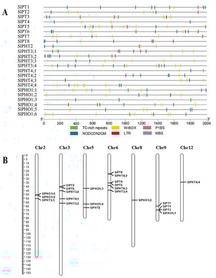 The main putative cis elements within 2 kb upstream promoter regions of SlPHT (A) and distribution of PHT genes on chromosomes in tomatoes (B).
