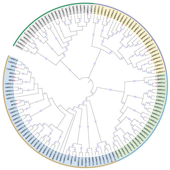 Phylogenetic tree showing the conserved domains of PHT proteins in Solanum lycopersicum and PHT genes from Arabidopsis thaliana, Oryza sativa, Capsicum annuum, and Sorghum bicolor. The phylogenetic tree was constructed by the NJ method implemented in MEGA 11 software with 1000 bootstrap replicates. Green: PHT2/PHT3 subfamily member; light purple: PHO1 subfamily member; blue: PHT4 subfamily member; yellow: PHT1 subfamily member. Purple circle: bootstrap values (17.85–100), Pink circle: PHT proteins in tomato.
