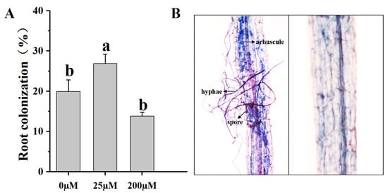 To better understand the effects of Pi concentrations on AM symbiosis in tomato roots, we investigated mycorrhizal colonization. Five weeks after inoculation with Funneliformis mosseae under 25 μM Pi concentration, greater than 20% of tomato roots contained AM colonization structures, and none of the NM tomato roots contained AM colonization structures at any Pi concentration (Figure 4B). The 25 μM Pi concentration significantly increased the root AM fungi colonization rate compared with Pi concentrations of 0 μM and 200 μM (Figure 4A).