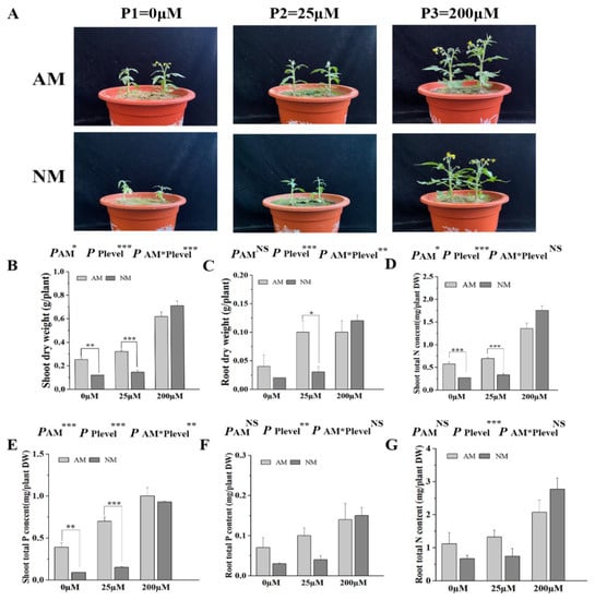 Effects of AM fungal colonization on tomato plant growth and P/N uptake under different concentrations of H2PO4− supply. (A) The plants were watered with nutrient solution containing different concentrations of H2PO4− weekly and harvested at 5 weeks post-inoculation (wpi) to assay the biomass (B,C), shoot total N/P content (D,E), and root total N/P (F,G) contents. NM, non-mycorrhizal; AM, arbuscular mycorrhizal. Values are the means ± SEs of three biological replicates from one pot (n = 3). The asterisks indicate significant differences. * p < 0.05, ** p < 0.01, *** p < 0.001.