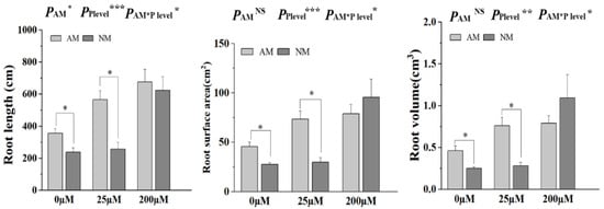Effects of AM fungal colonization on tomato root morphological plasticity under different concentrations of H2PO4− supply. NM, non-mycorrhizal; AM, arbuscular mycorrhizal. Values are the means ± SEs of three biological replicates from one pot (n = 3). The asterisks indicate significant differences. * p < 0.05, ** p < 0.01, *** p < 0.001.
