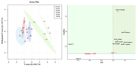 According to the OPLS-DA results, the AM and NM plants were clearly distinguished under all conditions. This result suggests that inoculation had a great impact on the physiological indicators of tomato compared with non-inoculated tomato under all conditions. The main physiological indices that produced differences in tomato were shoot P uptake, shoot biomass, shoot N uptake, and root morphological plasticity (Figure 7, VIP > 1 and FDR < 0.05). Our findings demonstrated that the influence of Pi status on the development of AM fungi affected tomato growth.