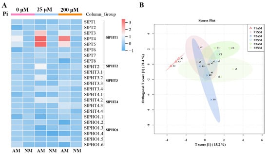 Heatmap analysis and OPLS-DA results of SlPHT gene expression in tomato roots under different P and inoculation conditions. (A) Transcripts of SlPHT in tomato roots of mycorrhizal (AM) and non-mycorrhizal (NM) plants. The color scale represents the variation in the expression of SlPHT, from high (red) to low (blue) contents. (B) Red (triangles), P1AM (P1 = 0 μM Pi); orange (+), P1NM (P1 = 0 μM Pi); blue (×), P2AM (P2 = 25 μM Pi); blue (diamonds), P2NM (P2 = 25 μM Pi); green (inverted triangles), P3AM (P3 = 200 μM Pi); green (checked boxes), P3NM (P3 = 200 μM Pi).