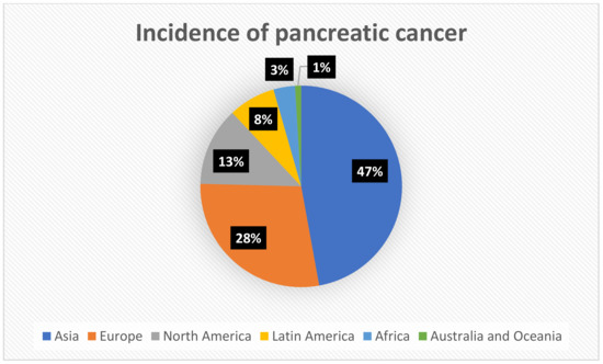 Data obtained from the WHO and GLOBOCAN 2020 shows that among all cancers, pancreatic cancer is 12th in terms of the incidence and seventh in terms of mortality for both sexes and all ages, respectively. The incidence rates of pancreatic cancer are similar among women and men, with a slight advantage among men—5.5 per 100,000 cases in men, and 4 per 100,000 cases in women, respectively [9,10]. According to the International Agency for Research on Cancer, an agency of the World Health Organization, more than 495,000 people developed pancreatic cancer in 2020, with more than half of these cases occurring in Asia and Europe, as shown in Figure 1. There have been several reasons attributed to this finding, but they are not entirely clear. In addition to factors such as obesity or smoking, the higher incidence of pancreatic cancer observed in countries from Asia and Europe has also been influenced by the extending lifetime that is measured by the Human Development Index. In countries with a longer life expectancy, there are older populations, and thereby pancreatic cancer is more common as it occurs more frequently in older people. Higher incidences in countries of Asia and Europe also result from the availability and quality of diagnostic measures that is different among the particular continents [11]. Statistics conducted by Cancer Research UK have shown that age-specific incidence rates rise from the ages of 35–40, but also that the peak incidence of pancreatic cancer occurs in the 7th and 8th decades of life. There is a general trend towards higher incidence rates of pancreatic cancer observed in developed countries compared to developing countries, which suggests that the large differences in this cancer incidence between these countries may be due to environmental factors [12]. Several syndromes contribute to an increased risk of pancreatic cancer in the high-risk group, for example, in the case of family history, the risk of developing pancreatic cancer increases with the increasing number of first-degree relatives diagnosed with PC (pancreatic cancer) [13]. Further examples of comorbidities include hereditary pancreatitis, cystic fibrosis, and hereditary breast ovarian cancer syndrome [13].