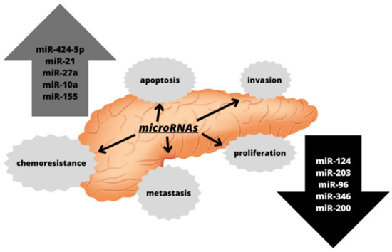 microRNAs are involved in the regulation of many physiological processes required for the function of the organism, including differentiation and apoptosis. However, they are also involved in the processes associated with the development of several diseases, such as angiogenesis or carcinogenesis. In the case of carcinogenesis, the changes in the expression of microRNAs during this process have been observed, and the diversity of the genes regulated by microRNAs makes it possible for them to behave both as oncogenes and as transformation suppressors [50]. The alterations in the expression of various microRNAs have also been observed in pancreatic cancers, as depicted in Figure 2. They have been associated with pancreatic cancer progression and metastasis, suggesting that microRNA expression profiling may serve as both diagnostic and prognostic biomarkers [56].