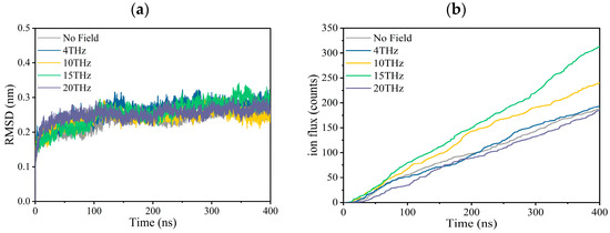 Effect of terahertz electric field on the property of the Kv1.2 channel. (a) Root Mean Square Deviation (RMSD) of the channel with or without an applied electric field. (b) Ion flux curves of potassium ion channels with or without an applied electric field.