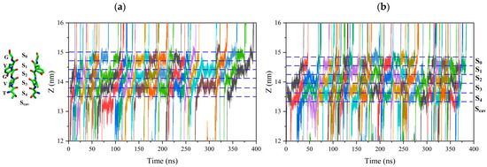 The permeation mode of ions passing through the SF region can be obtained according to the snapshots of ion position changes in the SF region at different times, and the results are shown in Figure 4. There are three kinds of ion permeation modes when potassium ions pass through the SF region: “soft knock-on” mode, “direct (hard) knock-on “mode, and “mixed knock-on” mode.
