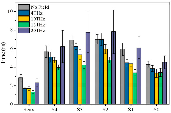 Figure 3 shows the residence time of potassium ions at each binding site under different conditions. We can see that an applied electric field can shorten the vibration time of ions at each binding site. The electric field of 15 THz reduced the vibration time of ions at each binding site most significantly.