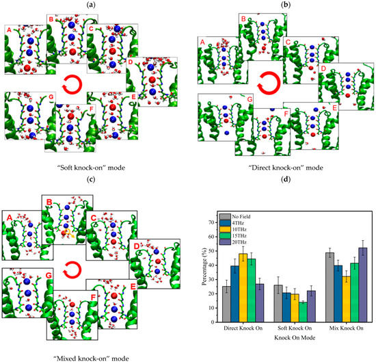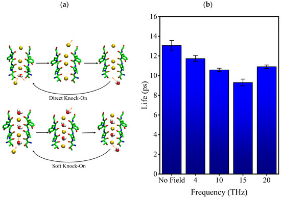Since the ion flux is highest at 15 THz compared with other cases (Figure 1b), our results are consistent with Kopfer’s theory [22,23], indirectly proving that the “soft knock-on” mode is a slower permeation mode for potassium ion channels. Water molecules are not essential for the permeation of potassium ions.