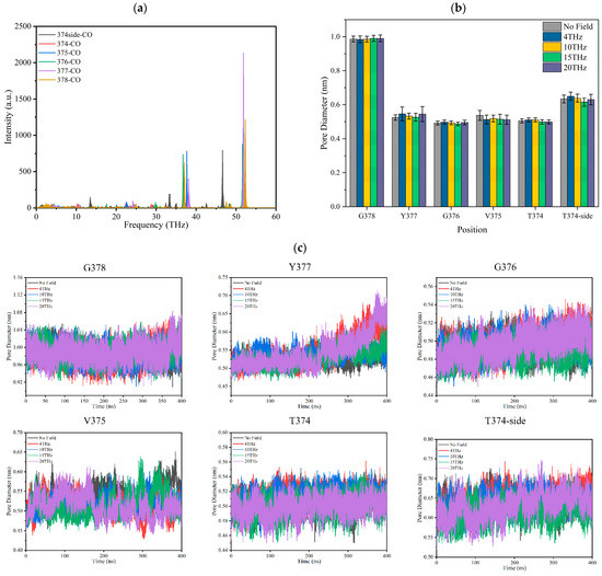 Figure 5c shows the pore diameter of the SF over time. The pore diameter of the SF is the distance between the carbonyl oxygen atom on each residue and the carbonyl oxygen atom on the symmetric residue in the SF. The change in SF average pore diameter under the action of different frequency electric fields is shown in Figure 5b. It can be seen that the SF pore diameter is stable under different electric fields except for Y377. The aperture at Y377 increases when the external field frequency is 4 THz or 20 THz. The results show that the applied terahertz electric field does not resonate with the SF binding site –C=O. This means it could not strengthen the vibration or twist of the –C=O bond to induce a conformational change in the SF. From Figure 5b, we can conclude that the applied electric field with a frequency of 15 THz has little effect on the average SF pore diameter compared to no field. Therefore, the change in ions permeability cannot be caused by the SF conformational change.