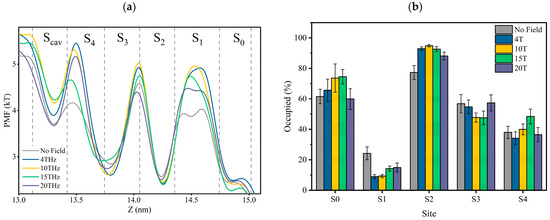 According to Figure 6a, the changes in ions’ PMF at each binding site under different conditions show that the applied electric field does alter the stability of the electrostatic bond between potassium ions and carbonyl groups. The preference of each site for potassium ions varies under different electric field conditions. The occupancy rate of potassium ions at each site is shown in Figure 6b, and it can be seen that an applied terahertz electric field could change the rate of potassium ions in the SF. It can be verified more directly that an applied terahertz electric field could affect the potential energy distribution of potassium ions in the SF, which is expressed as a change in the affinity of sites for potassium ions.