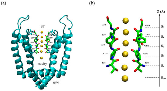 The model is based on the open-state crystal structure of Kv1.2 (PDB ID: 3lut), a voltage-gated potassium ion channel [19]. It is a tetramer structure consisting of four subunits with a pore domain (PD) in the center and a voltage sensor domain (VSD) around it. The VSD responds to the change in membrane potential and controls the opening and closing of the PD. The PD controls the permeation of ions. The PD can be divided into three regions from intracellular to extracellular: the gate, the cavity, and the selectivity filter (SF), as shown in Figure 8a. The SF consists of a conserved sequence T-V-G-Y-G, as shown in Figure 8b. The oxygen atoms of carbonyl groups or the hydroxyl group of the conserved sequence T-V-G-Y-G face the inner center form binding sites: S0, S1, S2, S3, S4, and Sc sites. Binding sites provide a tight binding for K+ ions when they pass through the SF. It has been found that potassium ions have specific permeation modes at SF binding sites, and these permeation modes are responsible for the high speed of potassium ion transport [20,21,22].
