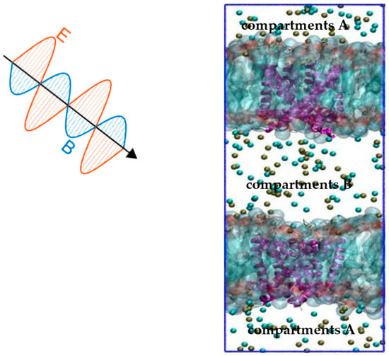 By far, the constant electric field (CEF) method [27] is the main method of molecular dynamics (MD) used to simulate the effect of an external electric field on ion channels. The CEF method originates from the Poisson−Boltzmann theory. Based on the theory, the transmembrane potential is represented by an external electric field applied along the normal direction of the membrane. Thus, the effect of the applied electric field on the protein channel can be obtained by changing the electric field normally along the membrane. The method is effective, but it is quite different from the actual situation. This is because the transmembrane potential of the ion channel is caused by the ion concentration gradient under physiological conditions. The ion imbalance (IIMB) method [25] is a method that is closer to physiological conditions. The transmembrane potential is generated by a small charge imbalance Δq that is produced by exchanging ions on both sides of the membrane. The Δq can be sustained by a forced recovery by exchanging ions on one side of the cell membrane and water molecules on the other side in the method. Combining these two methods, we propose a joint model: the “Constant Electric Field—Ion Imbalance” combined model. In this model, the transmembrane potential is produced by a small charge imbalance Δq of the IIMB method, and the external terahertz electromagnetic field on the channel comes from the CEF method. The combined model is shown in Figure 9.