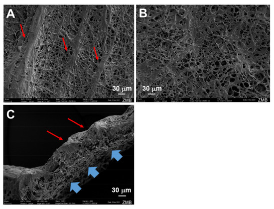 Scanning electron microscopy images of pure and IGF-1 containing tubes. Outer surface of emulsion electro-spun tube, exhibiting grooves (red arrows, (A)); inner surface of emulsion electro-spun tube with rather smooth surface (no grooves, (B)); cross-section of emulsion electro-spun tube showing grooves on outer surface (red arrows) and the smooth, but still porous, structure on the inner surface that faced the flat metal target during previous electrospinning (blue arrows, (C)). For the intended use in vivo, such tubes will be flipped so that the groove-like structure faces the repaired tendon, which makes the tube stay better in place due to the higher sliding friction coefficient of the grooved side [25].