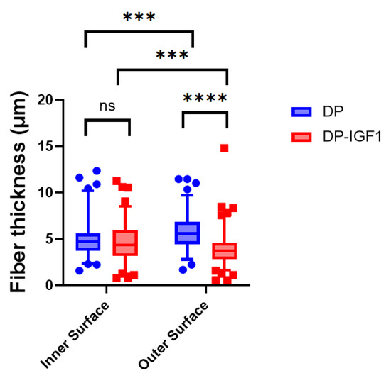 Fiber thickness of electro-spun meshes for pure DP meshes and emulsion electro-spun tubes containing IGF-1(DP-IGF1). For all tubes containing IGF-1, either in the middle layer or on the outer surface, the inner surface always consists of pure DP. Number of tubes n = 3. A nonparametric Kruskal–Wallis test was performed for each surface to determine significance in median difference. Data are shown as box and whisker plots with interquartile range and 95% confidence interval. p-values ≤ 0.05 were considered significant and denoted with p ≤ 0.001 (***); for p ≤ 0.0001 (****), and for non-significant (ns). Number of fibers used to assess diameters; inner surface DP n = 48 and DP-IGF-1 n = 141; outer surface DP n = 65 and DP-IGF-1 n = 167, respectively.