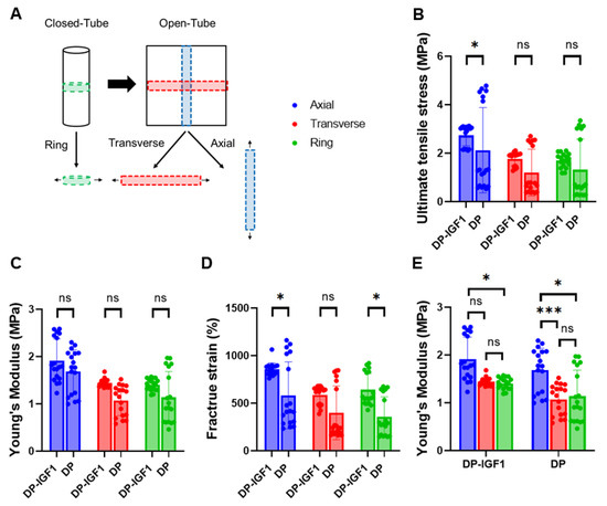 Mechanical properties of electro-spun tubes. Overview of how pieces were cut to assess mechanical properties in transverse and axial directions (A); ultimate tensile stress (B); Young’s modulus (C); fracture strain (D); Young’s modulus for IGF-1 (one layer) and pure DP tubes separately (E). The data are shown as mean and SD with individual values. n = 6. Mechanical properties were each compared by Kruskal–Wallis test, p-values ≤ 0.05 were considered significant and denoted with (*); for p ≤ 0.001 (***);and for non-significant (ns).