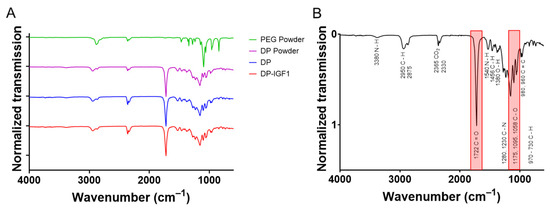 The FTIR assessment of IGF-1 containing tubes and pure DP tubes (n = 4) distributed on the y-axis as matter of presentation. As for electrospinning of DP and DP-IGF-1 tubes, a PEG layer is first produced, which is dissolved upon removal from the metal rod; the spectrum of PEG is added for comparison (A). For FTIR spectra of each single tube, see Figure S2. The FTIR assessment of DP tube with corresponding wavenumbers and chemical bonds, with most prominent peaks highlighted in red (B).