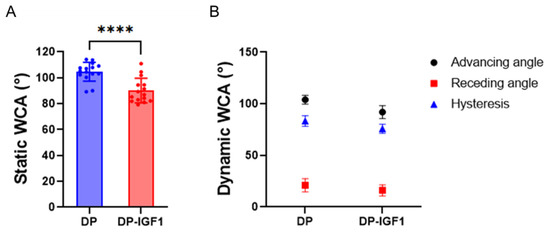 Static water contact angle (static WCA) of the inner surface for pure DP fiber mesh and emulsion electrospun DP fibers containing IGF-1 (A) and dynamic WCA, hysteresis = advancing WCA—receding WCA (B). WCAs for emulsion electro-spun tubes were determined to be statistically significantly lower than for pure DP tubes. For static WCA and dynamic WCA, five and three measurements, respectively, were averaged per sample, n = 3. The data are shown as mean and SD. The static contact angles were compared with an unpaired t-test; with p ≤ 0.0001 (****).