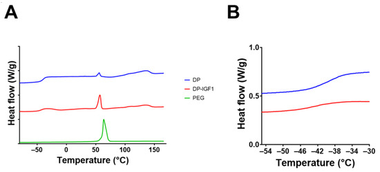 Furthermore, thermograms were assessed for the different materials (Figure 6 and Figure S3). The DSC spectra for DP tubes and IGF-1-containing emulsion electro-spun DP tubes looked very similar, with a melting point of approximately 130 °C, which confirms previous findings for DP powder (129 °C) and electro-spun pure DP mesh (134 °C) [9]. In contrast, pure PEG has a melting point of 70 °C. However, when PEG impurities are in electro-spun DP meshes, the melting shifts to slightly lower melting points, i.e., 65 °C [9], which was confirmed here (Figure 6A). As for the glass transition point, it was found at approximately −38 °C for DP [43].