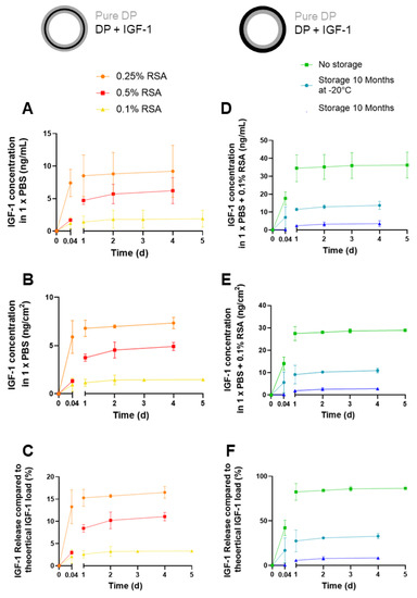 In addition, release kinetics of two-layer tubes (one layer with IGF-1 (0.1% RSA), one layer with pure DP fibers) were assessed immediately after production (no storage), and after 10 months of storage at either room temperature (RT) or −20 °C, respectively (Figure 7B). As can be seen, no storage leads to the highest amounts of released IGF-1, followed by storage at −20 °C and with comparably low amounts of released GF when tubes were stored at RT.