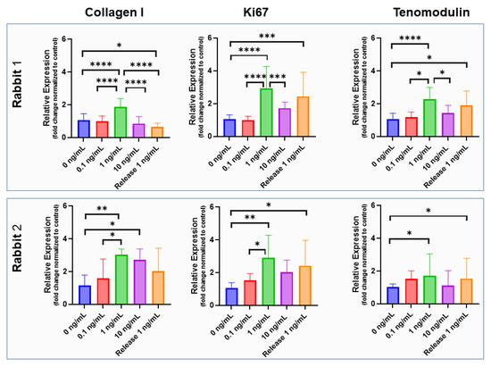 Bioactivity of incorporated IGF-1. Gene expression of rabbit Achilles tenocytes exposed to supplemented IGF-1 in concentrations of 0, 0.1, 1 and 10 ng/mL as well as exposed to IGF-1 released from emulsion electro-spun meshes (concentration 1 ng/mL; denoted as Release 1 ng/mL) for two rabbits (upper and lower row) and three markers (collagen I, ki67 and tenomodulin); assessed for a 3-day cell culture. The data are shown as mean and SD, p-values ≤ 0.05 were considered significant and denoted with (*); for p ≤ 0.01 (**); for p ≤ 0.001 (***); for p ≤ 0.0001 (****). For impact of IGF-1 supplementation to rabbit Achilles tenocyte culture on cell morphology, see Figure S6.